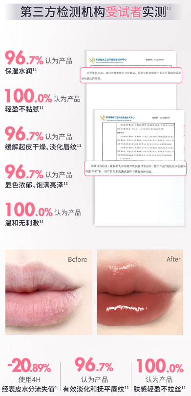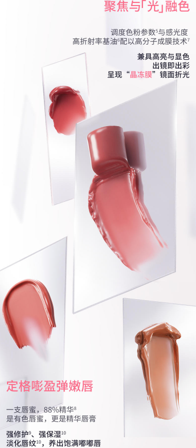 • 鏡面/水光光澤:妝效偏向濕潤閃光或鏡面水光,使用後唇部亮度明顯,可以反光,有光澤感。