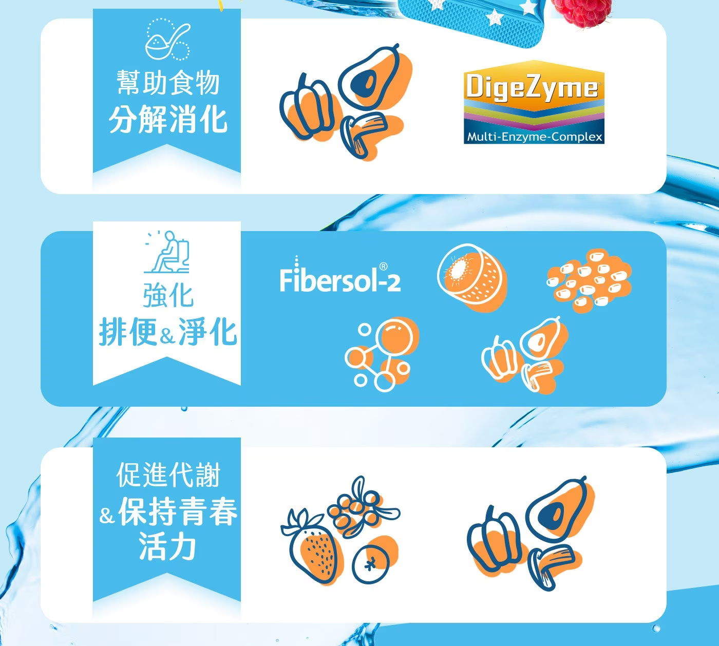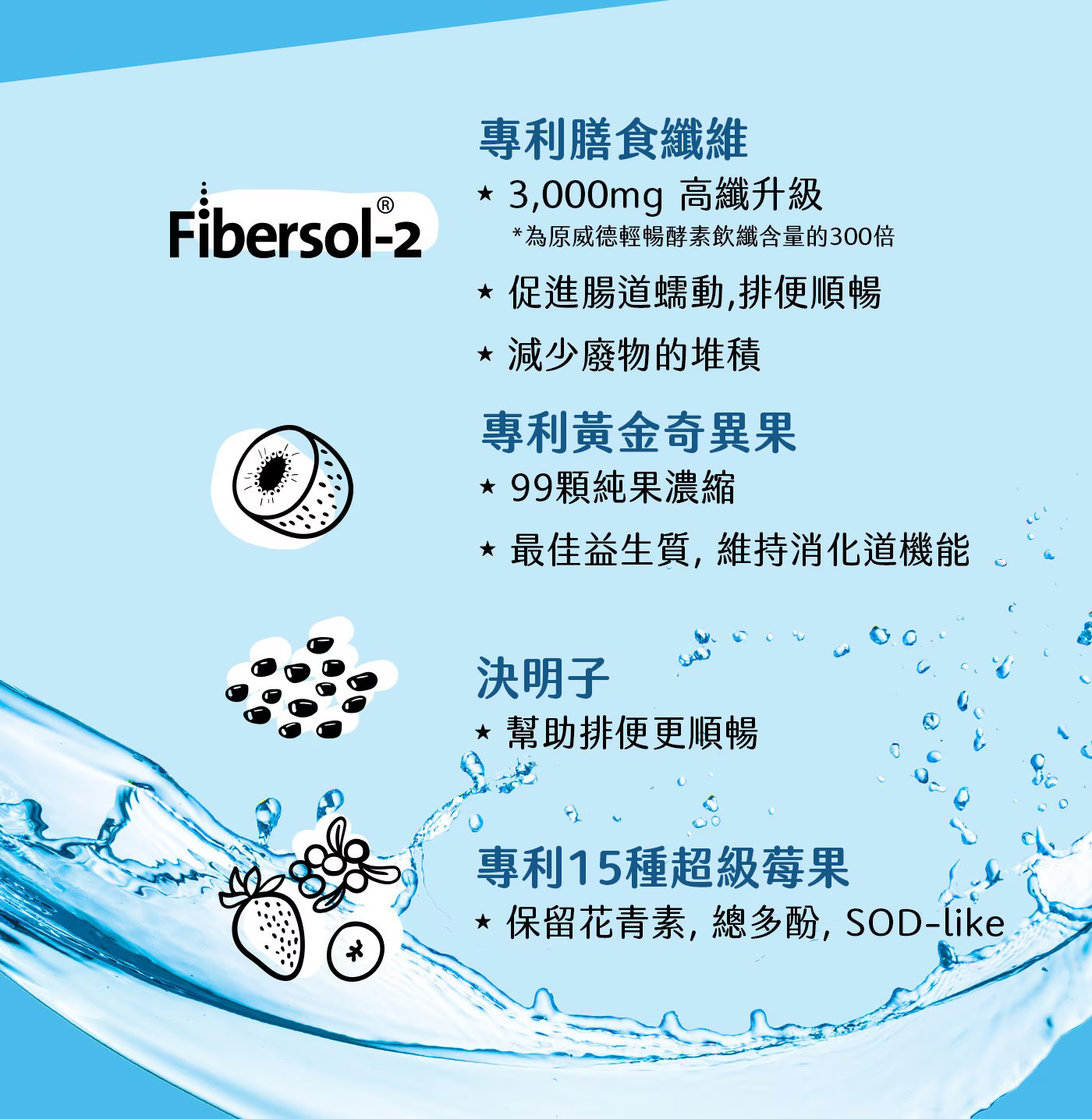 排便淨化: 專利纖維 Fibersol-2 +專利黃金奇異果+決明子