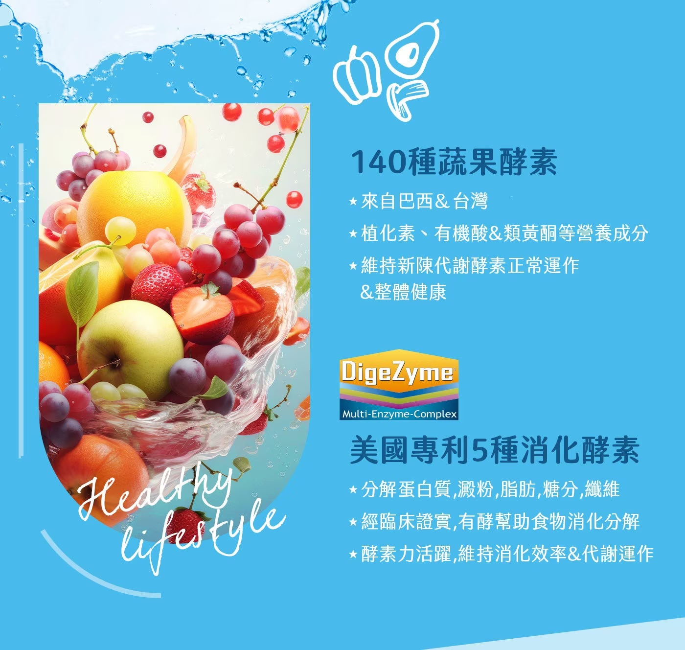 分解消化: 140種蔬果酵素+美國DigeZyme 5種消化酵素