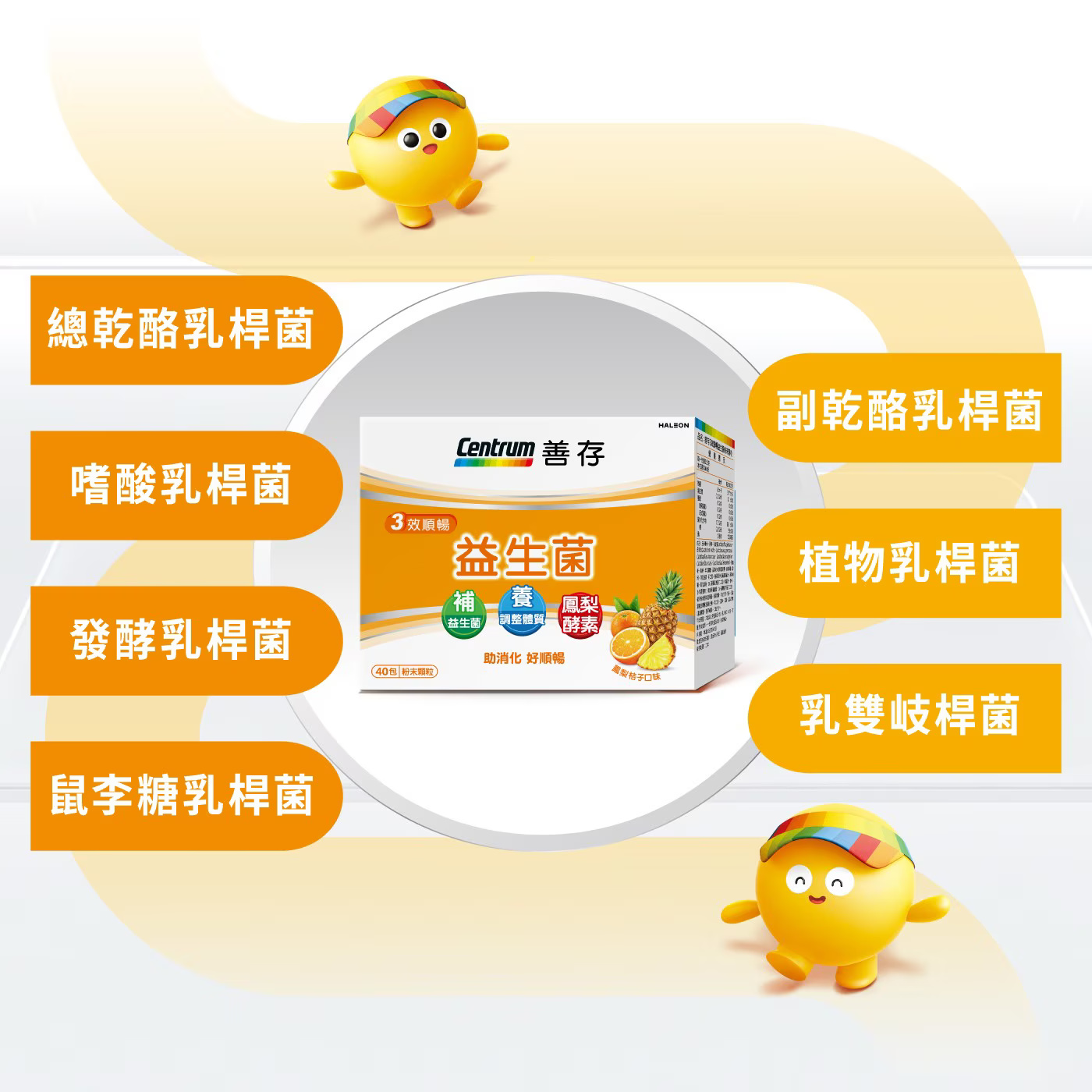 玉米澱粉、乳糖、乳酸菌(Lactobacillus plantarum植物乳桿菌、Bifidobacterium lactis乳酸雙歧桿菌、Lactobacillus paracasei副乾酪乳桿菌、Lactobacillus rhamnosus鼠李糖乳桿菌、Lactobacillus acidophilus嗜酸乳桿菌、Lactobacillus casei凱氏乳桿菌、Lactobacillus fermentum發酵乳桿菌)、果糖粉、菊糖、半乳寡醣、鳳梨粉末香料(葡萄糖、麥芽糊精、香料、阿拉伯膠、丙二醇)、蘋果果汁粉(蘋果濃縮汁、麥芽糊精、氧化澱粉、DL-蘋果酸(羥基丁二酸)、檸檬酸、香料、β-胡蘿蔔素)、異麥芽寡醣漿、DL-蘋果酸(羥基丁二酸)、桔子粉末香料(葡萄糖、麥芽糊精、阿拉伯膠、香料、混合濃縮生育醇(抗氧化劑)、丙二醇、乙醇)、乙醇、鳳梨酵素(鳳梨酵素、麥芽糊精)、二氧化矽。
