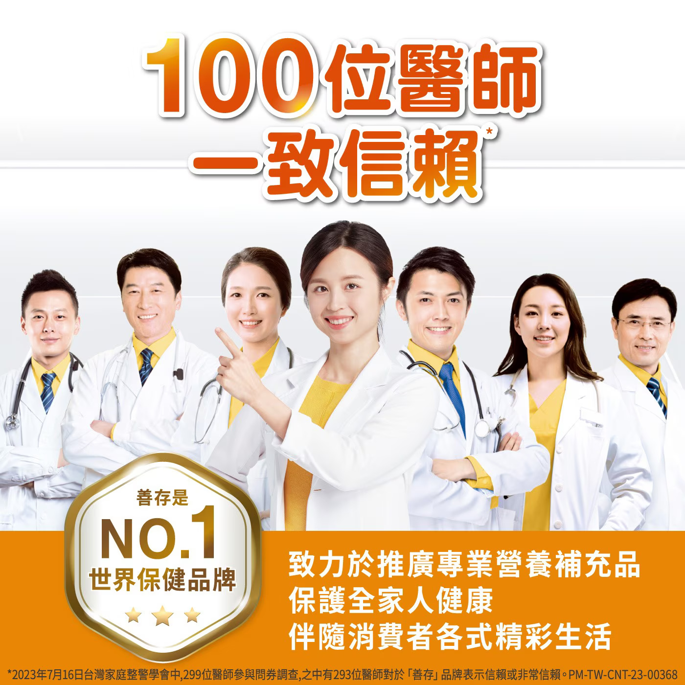 (註2)2023年7月16日台灣家庭醫學醫學會中, 299位醫師參與問卷調查,之中有293位醫師對於「善存」品牌表示信賴或非常信賴。