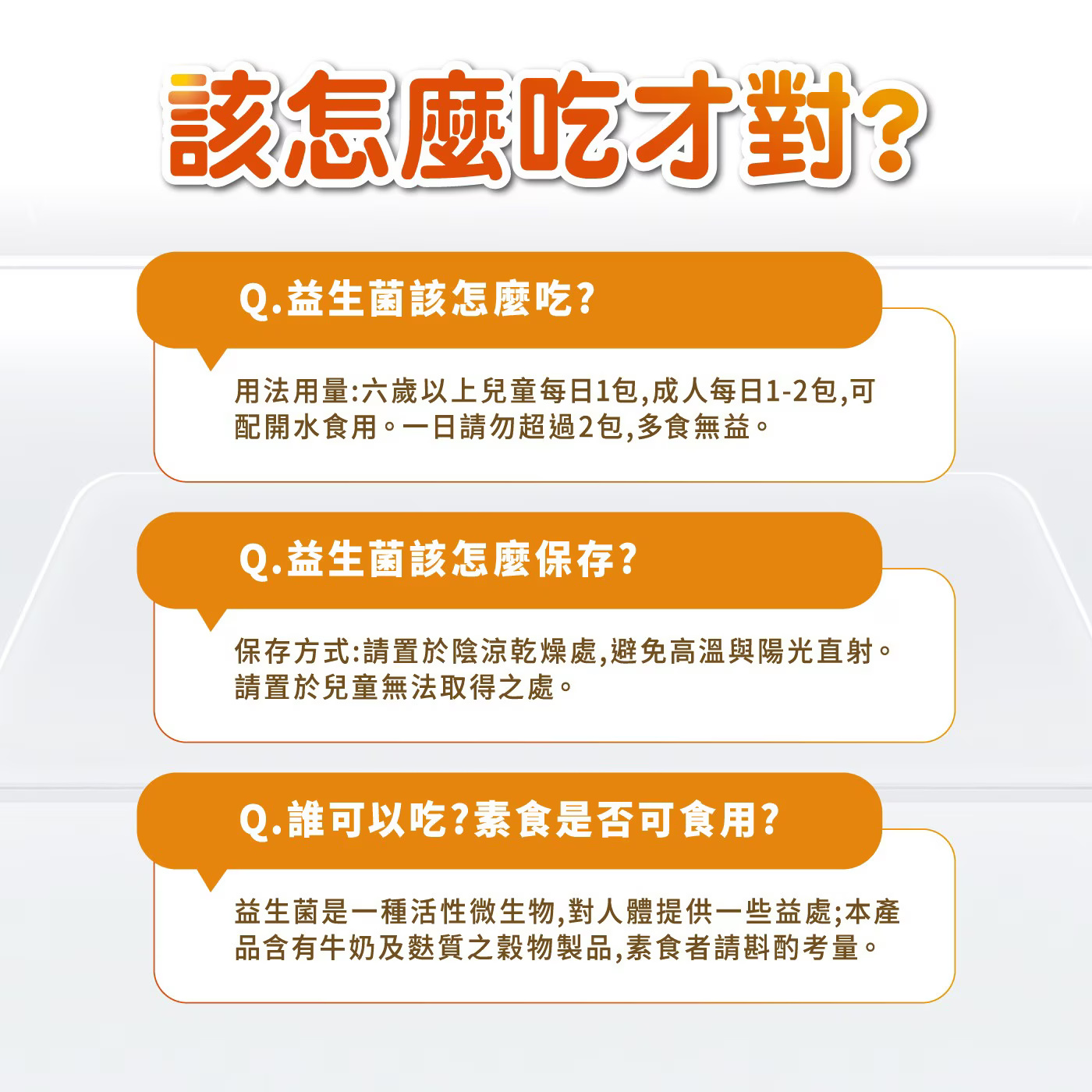 六歲以上兒童每日1包,成人每日1-2包,可配開水食用。一日請勿超過2包,多食無益。