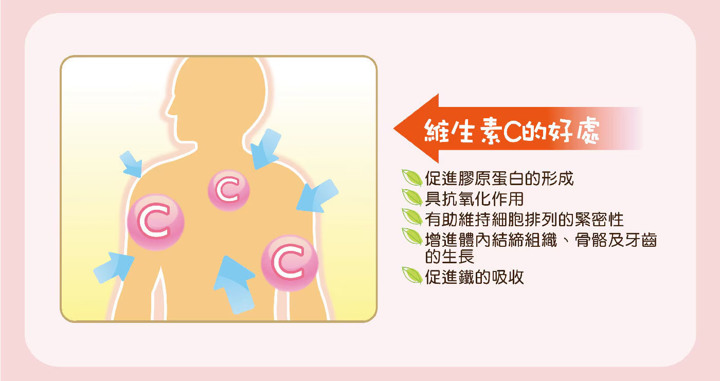 維生素C可促進膠原蛋白的形成、具抗氧化作用、有助維持細胞排列的緊密性、增進體內結締組織、骨骼及牙齒的生長、促進鐵的吸收