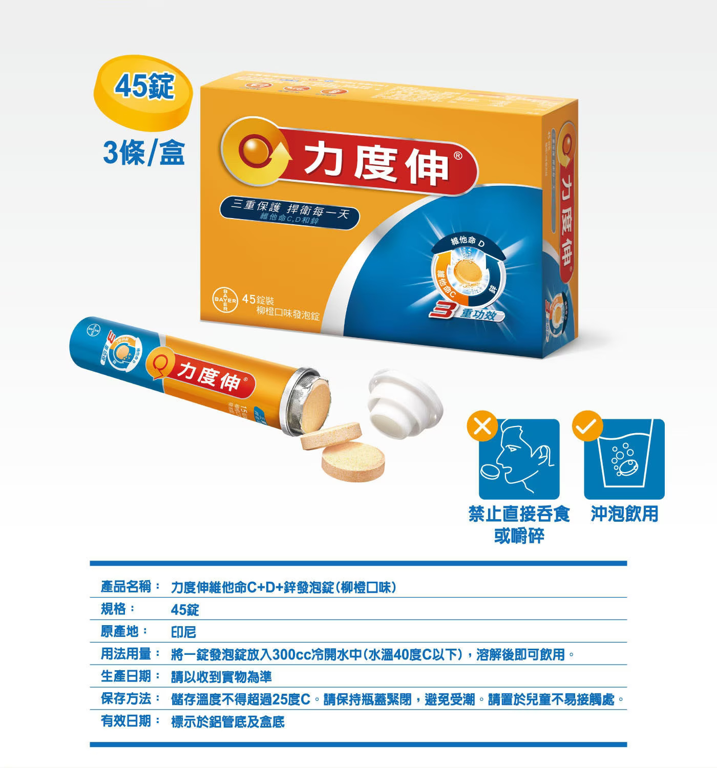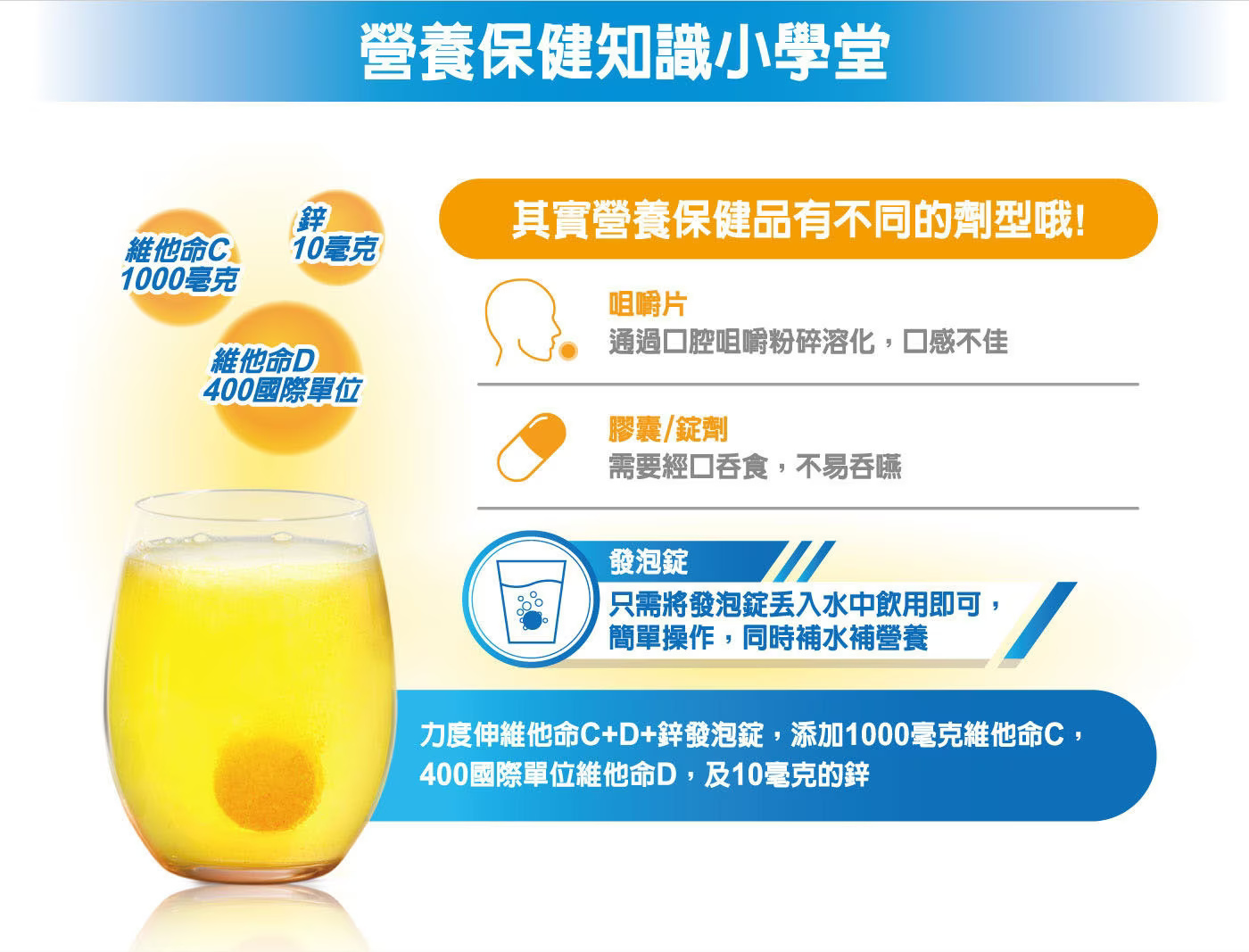 將一錠力度伸發泡錠放入200~300 cc冷開水中(水量可依個人喜好口感調整),溶解後即可飲用,為達最佳口感及效果,建議水溫控制在40°C以下。建議於隨餐或餐後食用以利脂溶性維生素之吸收,每日建議用量勿超過一錠,多食無益。