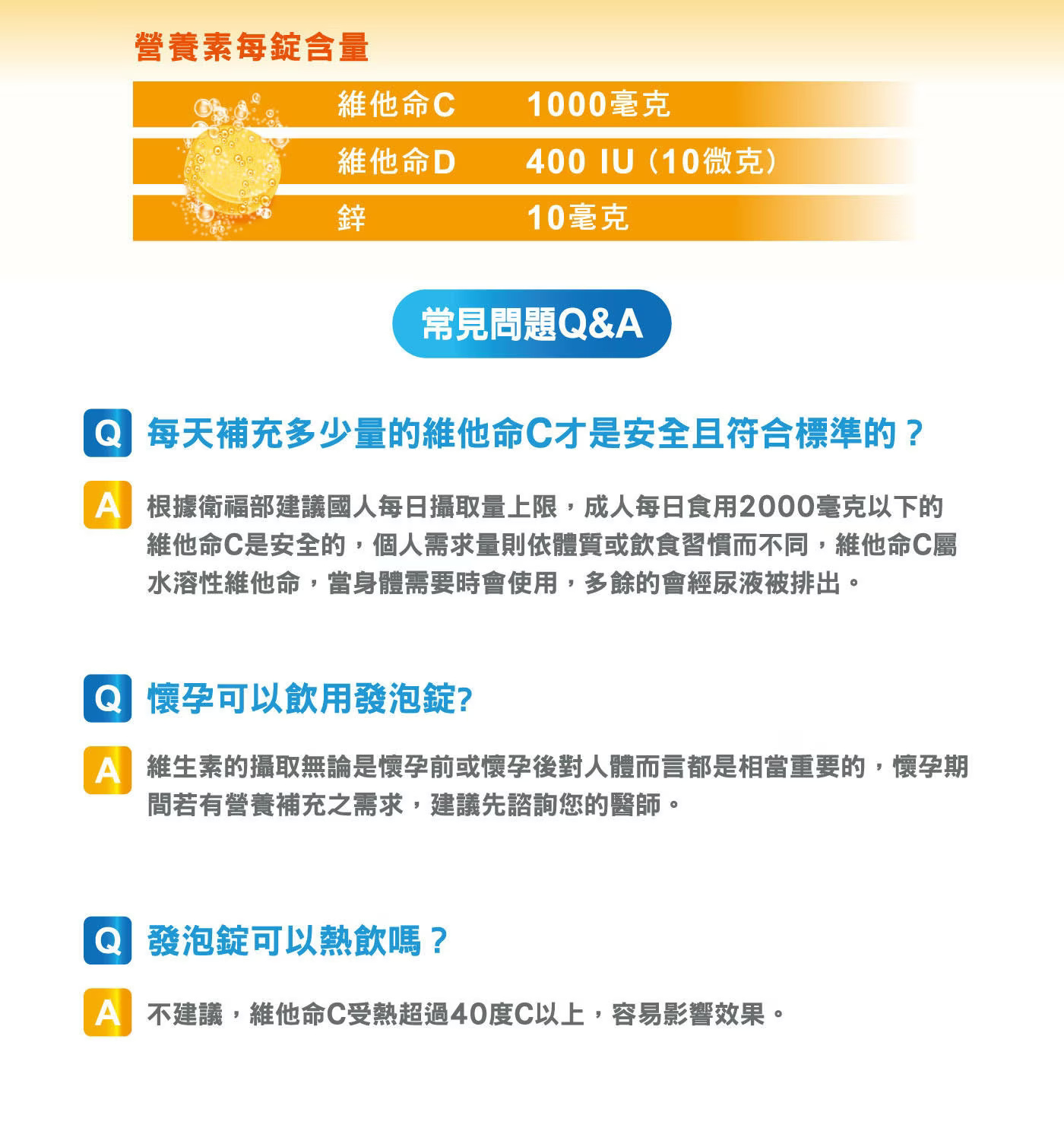 維生素C、碳酸氫鈉、無水檸檬酸、巴糖醇、DL-蘋果酸、β-胡蘿蔔素[乾葡萄糖漿、阿拉伯膠、中鏈三酸甘油酯、蔗糖、抗氧化劑(L-抗壞血酸鈉、維生素E)、β-胡蘿蔔素、二氧化矽]、無水碳酸鈉、柳橙香料(辛烯基丁二酸鈉澱粉、香料、玉米糖漿固形物、麥芽糖、混合濃縮生育醇(抗氧化劑)]、檸檬酸鋅三水化合物、醋磺內脂鉀(甜味劑)、氯化鈉、蔗糖素(甜味劑)、維生素D3[辛烯基丁二酸鈉澱粉、蔗糖、L-抗壞血酸鈉(抗氧化劑、中鏈三酸甘油酯、二氧化矽、維生素E(抗氧化劑)、膽鈣化醇]。