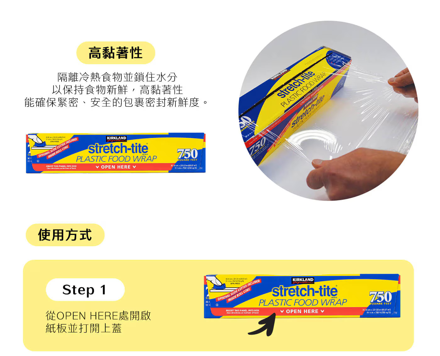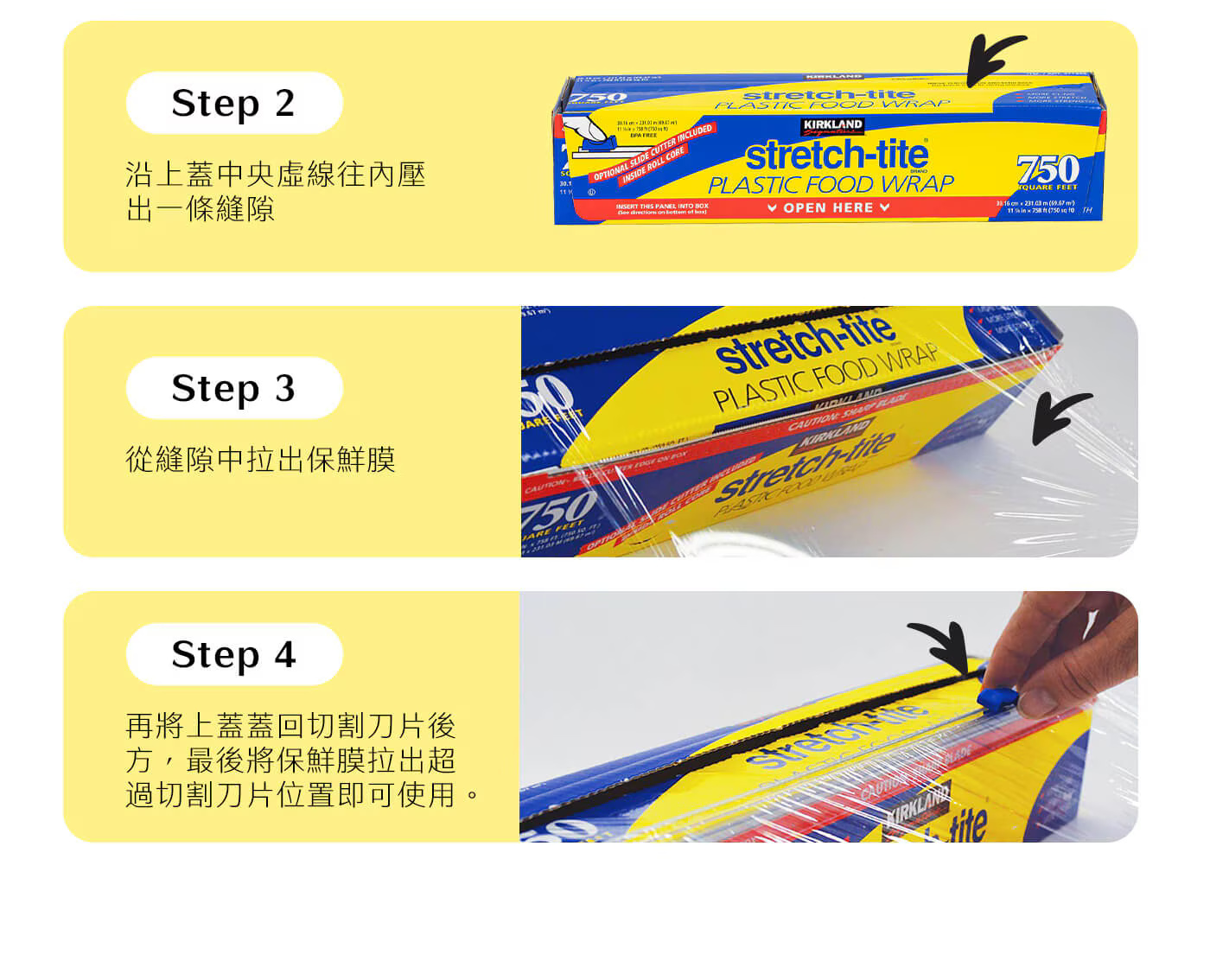 1. 使用固定式切割刀片:從OPEN HERE處開啟紙板並打開上蓋,沿上蓋中央虛線往內壓出一條縫隙,從縫隙中拉出保鮮膜,再將上蓋蓋回切割刀片後方,最後將保鮮膜拉出超過切割刀片位置即可使用。