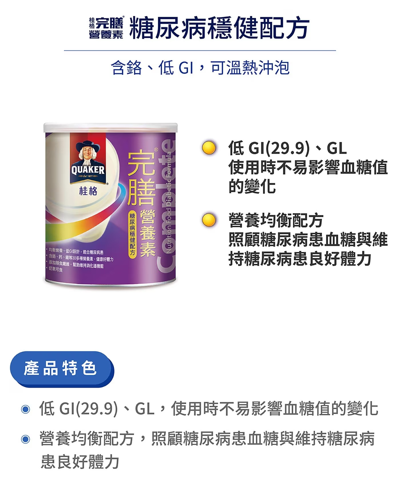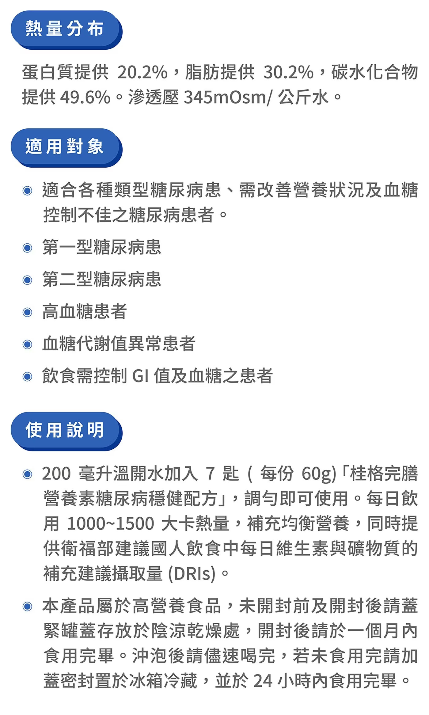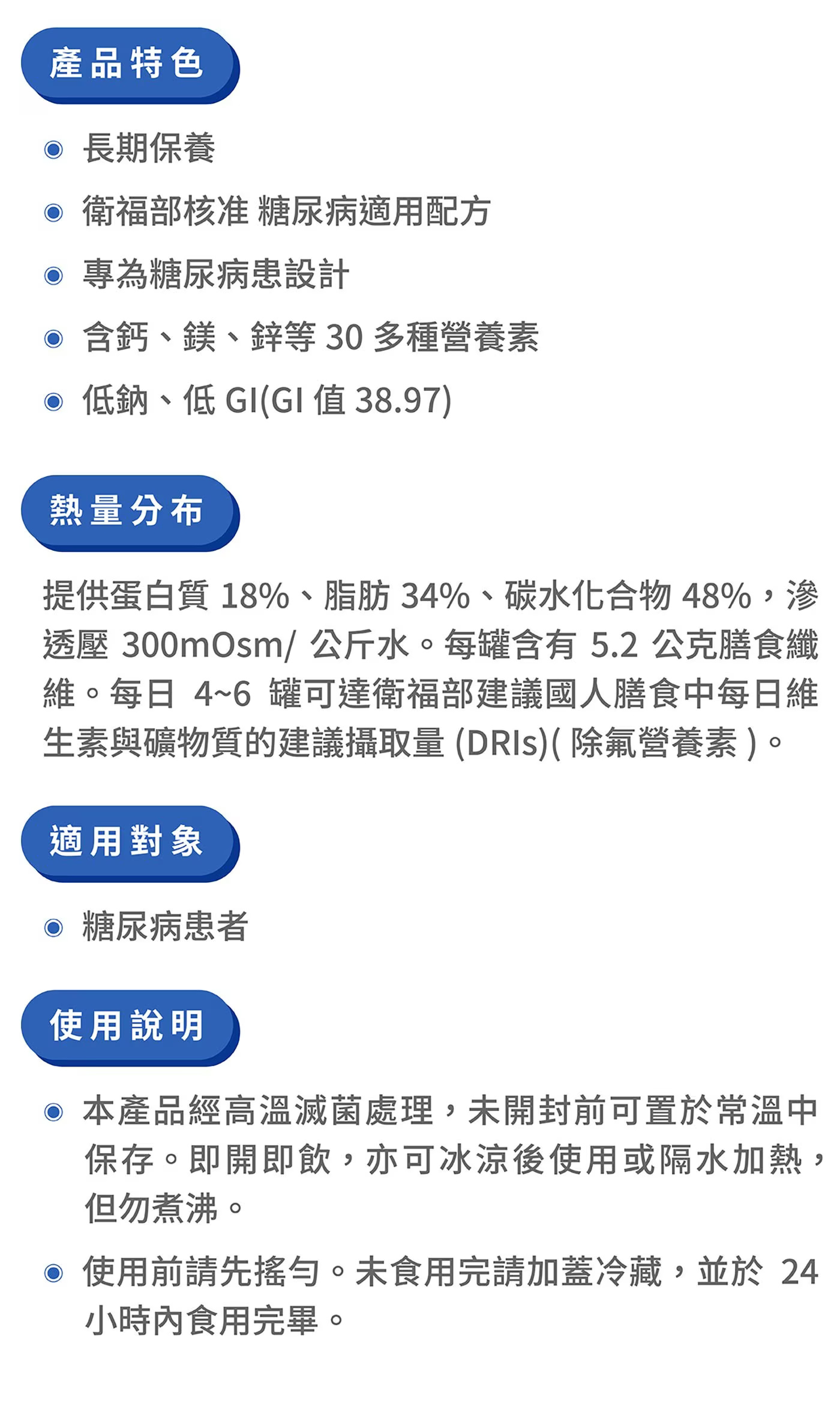 本產品專為糖尿病患以及葡萄糖耐受不良的患者所設計,含有30多種營養素且具有膳食纖維、鉻,能促進新陳代謝,配方含有鈣、低鈉、低GI,能成為糖尿病患短期與長期使用的正餐與點心。