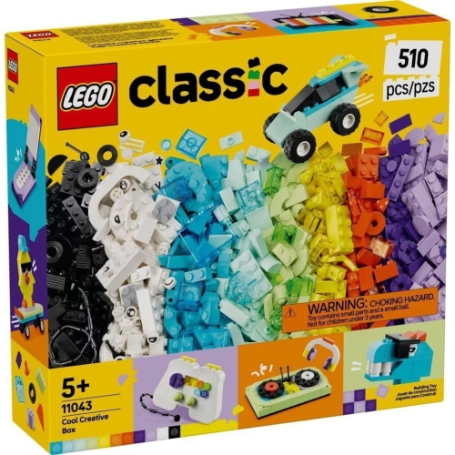 LEGO 11043 是一款名為「Cool Creative Box」的 LEGO Classic 套裝,適合 5 歲及以上的孩子。 這款套裝包含 510 塊積木,旨在激發孩子們的創造力和想像力。 這款套裝的特色包括: 多樣的模型:孩子們可以建造遊戲控制器、戴眼鏡的恐龍、可開合的手機、滑板、怪物卡車和帶耳機的 DJ 套裝等模型。 豐富的配件:包含眼睛、輪子和鉸鏈等特殊元素,讓孩子們可以創建和組合各種有趣的模型。 無限的創意樂趣:孩子們可以將模型組合和自定義,創造更多的遊戲可能性,例如將耳機戴在恐龍上,或讓恐龍站在滑板上。