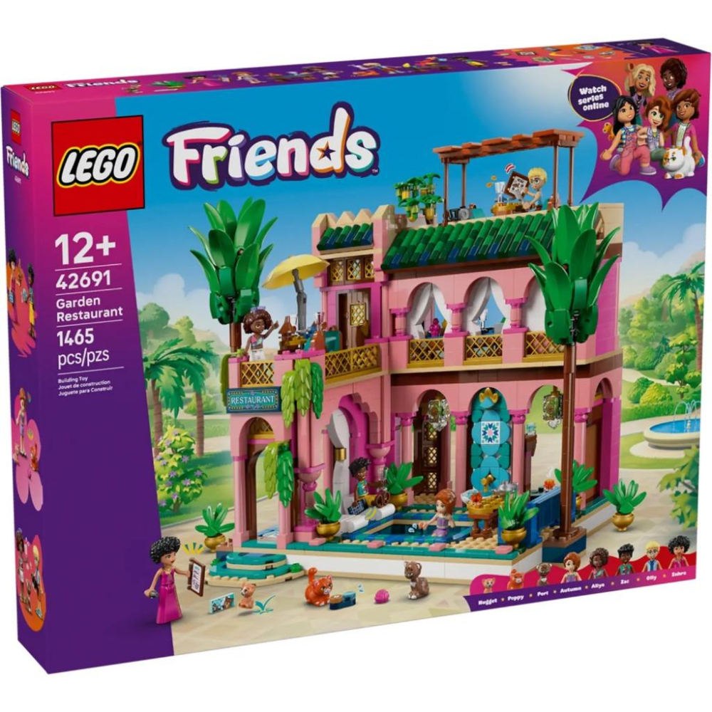 使用樂高® 好朋友花園餐廳拼搭套件 (42691) 向 12 歲及以上的兒童介紹詳細的項目。 5 個迷你玩偶(Zahra、Aliya、Autumn、Zac 和 Olly)和 3 隻貓讓這套盒組栩栩如生。配件包括瓷磚、燈具、餐具、玻璃杯、塔吉鍋、菜單、樂高® 食品、茶壺等。這個充滿活力的盒組充滿了細節和色彩繽紛的裝飾瓷磚。孩子們在組裝餐廳的每一部分時,都會投入到一個身歷其境的項目中。探索豪華酒店的所有零件,包括接待處和餐廳。露台、游泳池或辦公室,眾多的空間邀請孩子們盡情發揮他們的想像力。該盒組是送給 12 歲及以上男孩和女孩的有趣禮物。 LEGO Builder 應用程序提供了有趣的拼搭冒險和縮放、旋轉 3D 模型、保存集和跟踪進度的工具。包含 1,465 顆粒。 - 拼砌餐廳 - 12 歲及以上的女孩和男孩可以通過組裝餐廳模型的複雜細節(包括 5 個迷你玩偶、3 隻貓和配件),投入到一個令人興奮的身歷其境的項目中 - 建築細節——色彩鮮豔的建築,裝飾著複雜的設計,充滿了值得探索的特色,如拱廊、走廊、接待處、辦公室、餐廳、露台和游泳池 - 5 個樂高® 好朋友角色 – 樂高® 好朋友餐廳花園 (42691) 包括 Zahra、Aliya、Autumn、Zac 和 Olly 迷你玩偶人物,以及 3 個貓玩偶,讓孩子們可以創建一個非常適合玩耍和展示的模型 - 多種配件 - 激發創造力,邀請孩子們使用裝飾瓷磚、燈具、餐具、玻璃杯、塔吉鍋、菜單、樂高® 食品、茶壺等配件來個性化他們的模型 - 禮物創意 – 這款創意玩具是送給 12 歲及以上女孩和男孩的一份迷人樂高® 禮物,他們會喜歡拼砌一家鼓勵創意玩耍的精緻餐廳,然後展示它 - 在線系列 - 通過其他盒組(單獨出售)和樂高® 好朋友:新篇章在線系列探索更多創意遊戲創意,孩子們可以在其中與心湖城的角色見面