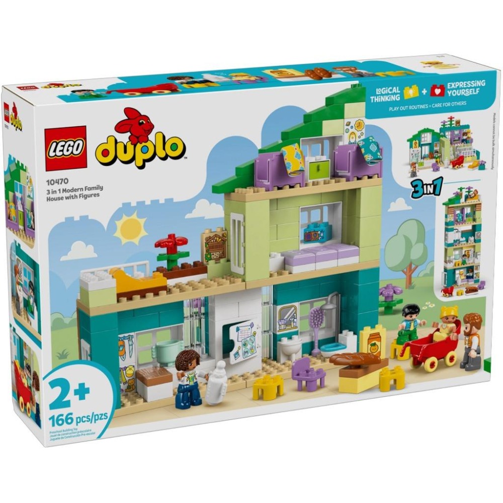 2 歲及以上的兒童可以使用三合一現代家庭住宅拼搭套件 (10470) 重現他們的家庭生活。這款互動玩具包括 4 個角色(2 位父母、1 個孩子和 1 個嬰兒),為幼兒在家庭生活中提供有趣的社交和情感學習活動。這款玩具可激發精細運動技能,並提供大量創意可能性,因為孩子們可以使用相同的樂高® 得寶積木搭建 3 個模型。他們可以選擇帶有屋頂花園和休閒椅和昆蟲旅館等配件的 3 或 5 層公寓或房屋。這款創意遊戲包含許多幼兒熟悉的日常物品零件,例如冰箱、廁所和嬰兒車。它們促進講故事,激發孩子的創造力,並幫助他們更好地理解家庭中的日常生活和不同角色。包含 166 顆粒。 - 精緻的房子——現代三合一家庭住宅 (10470) 提供通過角色扮演促進幼兒社交和情感學習的活動,並邀請他們重現家庭中的日常生活和互動 - 1 套,3 種拼砌選項 – 小孩子們在拼砌和改造這座三合一房屋時探索自己的創造力,打造 3 間不同的現代住宅,設有 2 間臥室、1 間浴室和 1 間廚房 - 重現家庭生活的各個片段 – 幼兒利用這款樂高® 得寶 My Town 盒組探索家庭情感和關係,其中包括媽媽、爸爸、孩子和嬰兒人物 - 家居配件 - 這款適合小女孩和男孩的玩具包括可識別的零件,例如嬰兒奶瓶、嬰兒車、水槽、廁所、冰箱和帶昆蟲旅館的屋頂花園 - 適合 2 歲及以上兒童的禮物創意 – 這款樂高® 得寶盒組專為幼兒女孩和男孩設計,具有啟發講故事的功能,是送給喜歡角色扮演家庭生活的孩子的一份有趣的生日禮物 - 幼兒安全玩具——這座拼搭遊戲屋中的所有積木和配件都經過全面測試,確保符合兒童安全標準 - 增強幼兒的拼搭技能 - 這款樂高® 得寶房子有助於培養孩子在打開門窗時的創造力、情商和精細運動技能 - 尺寸 - 這款 166 顆粒樂高® 得寶盒組的主要模型是送給幼兒的絕佳禮物,尺寸超過 36 公分高、49 公分寬和 33 公分深