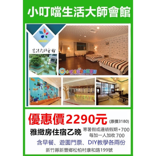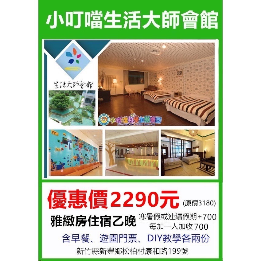 小叮噹科學主題樂園 生活大師會館雙人住宿券(無使用期限) 雙人一泊二食專案(早餐+下午茶) 【票券使用說明】 1.本券含早餐2客、遊園門票2張、DIY教學券2張、贈下午茶2客 2.超出人數住宿依規定滿3歲收費,加人每位700元/人,每房最多入住八人。 【(加人部份-無贈送下午茶)不分大人小孩,3歲以下免收費】 3.本券不得折現、找零或與其他優惠案並用。 4.本券團體不適用,於平假日皆可使用,如遇連續假期三天(含)及暑假平日/假日適用(連續假期、暑假房間每間需補差額700元)。 5.訂房規定(1.)暑假7、8月訂房限6月1日起預約、需補差額每間700元(連續假期、暑假房間)。(2)其除時段訂房限2個月內預約。 6.持券訂房需匯訂金1000元,入住時訂金退回,以確保訂房權益,取消訂房訂金退款,依據「個別旅客定型化契約應記載及不得記載事項」辦理。 7.本房型為環保房,不提供毛巾、紙拖鞋、牙膏、牙刷。 8.本券為不記名有價證券,凡遺失或損毀、破裂致無法辦識禮券編號及禮券內容,恕不補發。 9.農曆春節期間需依飯店公告加價。 10.無使用期限 11.訂房專線:(03)559-4999