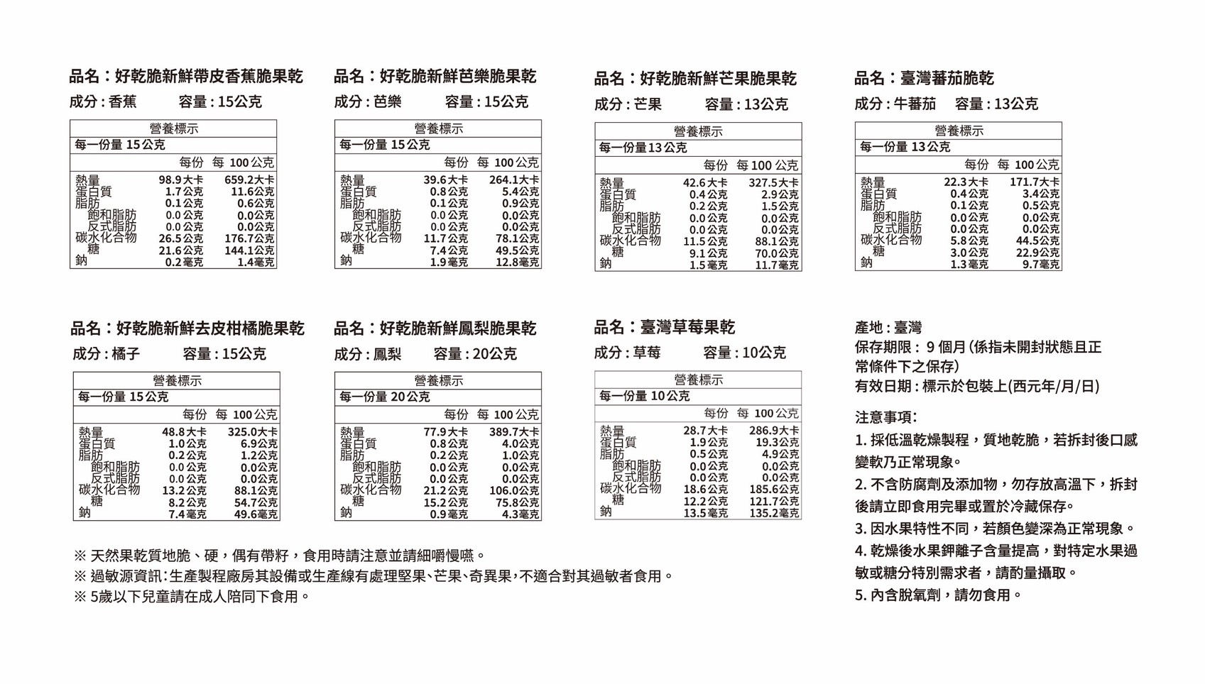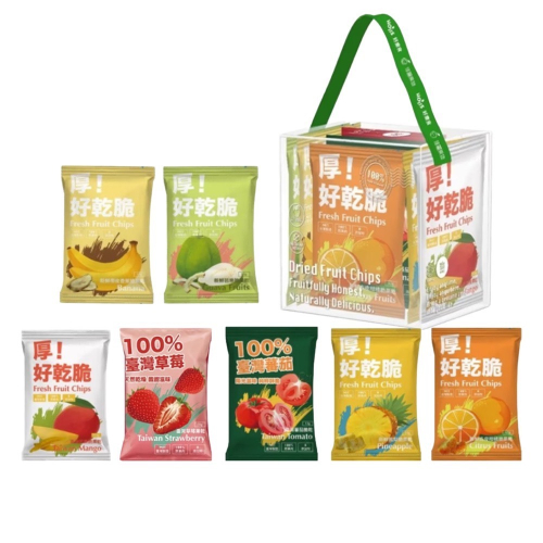 七包裝(含手提盒) : 鳳梨20克 / 橘子15克 / 香蕉15克 / 芭樂15克/草莓10克/芒果13克/蕃茄13克 各1包