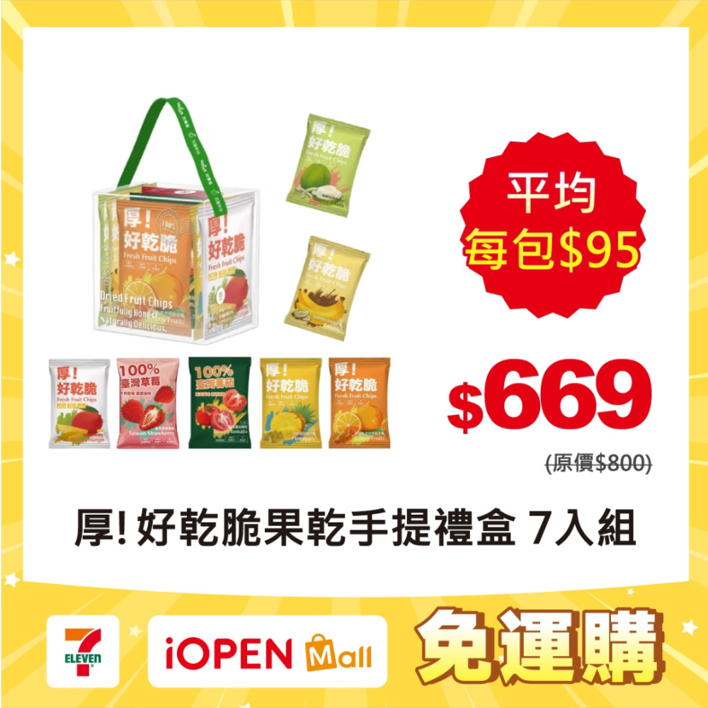 七包裝(含手提盒) : 鳳梨20克 / 橘子15克 / 香蕉15克 / 芭樂15克/草莓10克/芒果13克/蕃茄13克 各1包