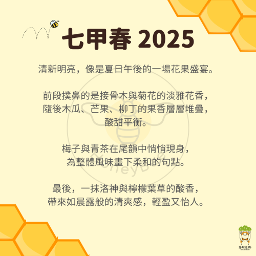清新明亮,像是夏日午後的一場花果盛宴。前段撲鼻的是接骨木與菊花的淡雅花香,隨後木瓜、芒果、柳丁的果香層層堆疊,酸甜平衡。梅子與青茶在尾韻中悄悄現身,為整體風味畫下柔和的句點。最後,一抹洛神與檸檬葉草的酸香,帶來如晨露般的清爽感,輕盈又怡人。