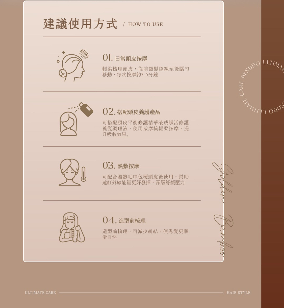 ✔ 日常按摩:早晚梳理3–5分鐘,幫助放鬆頭皮與減壓