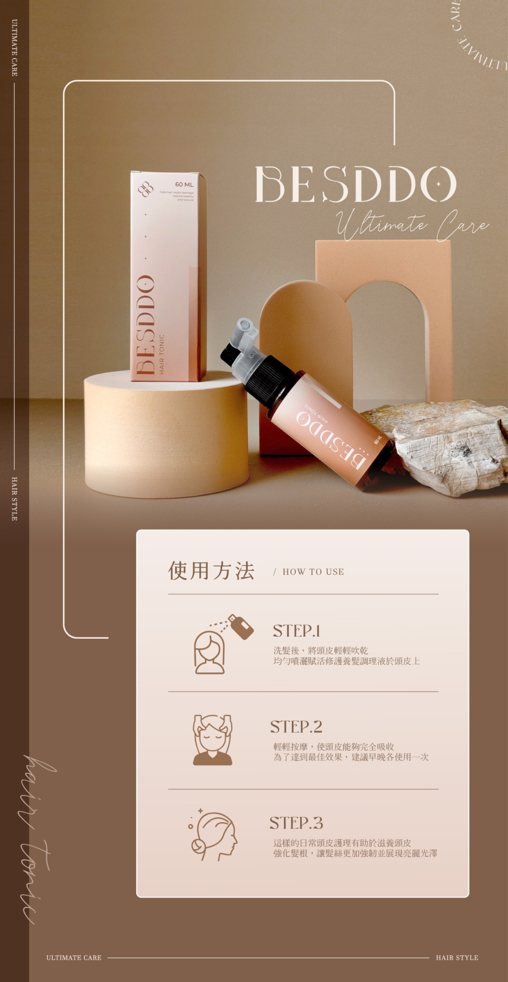 BESDDO 賦活修護養髮調理液,從頭皮環境開始調理,讓髮絲感覺更有支撐感,打造穩定而安心的日常保養習慣。