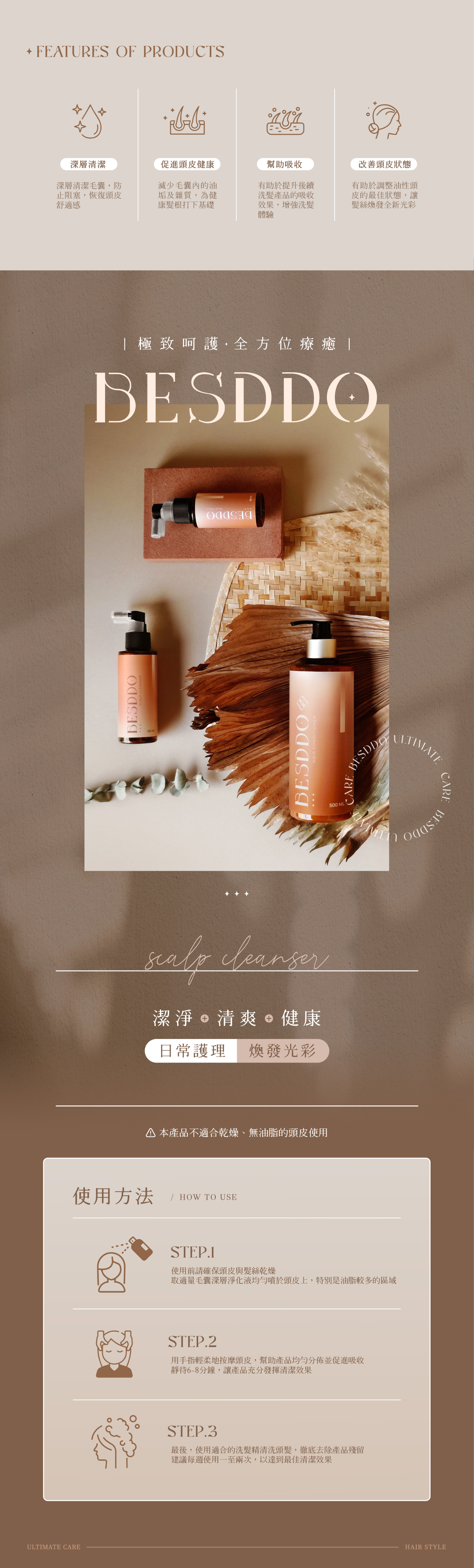 A:建議搭配 BESDDO 深層控油平衡髮浴或蓓淨角質淨化髮浴使用。