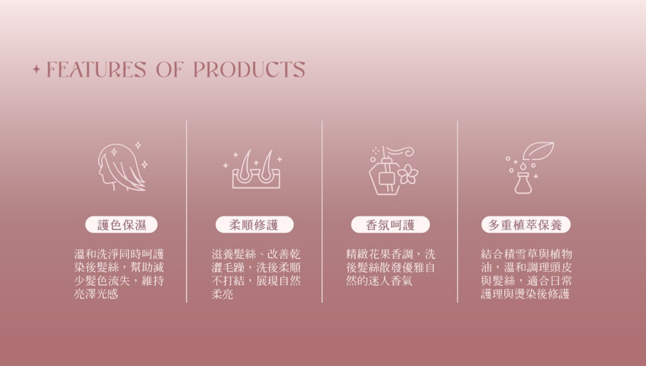 ✔ 洗淨同時注入滋養修護因子,減少褪色、毛躁與扁塌