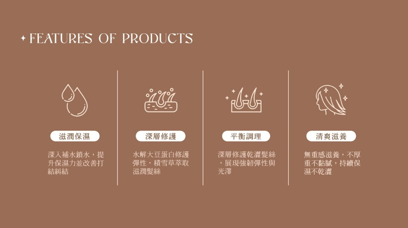 • 水解大豆蛋白:修護受損髮芯,增加柔順彈性