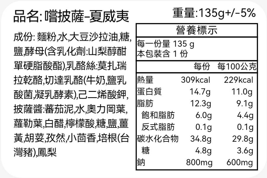 主要成分:餅皮、雙色乳酪絲:莫扎瑞拉乾酪,切達乳酪、披薩醬、培根(台灣豬), 鳳梨