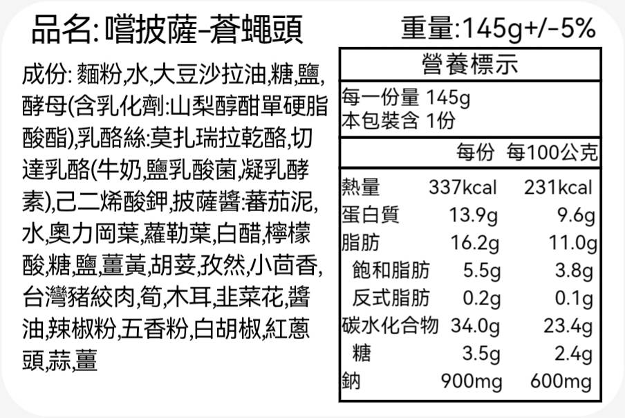 主要成分:餅皮、雙色乳酪絲:莫扎瑞拉乾酪,切達乳酪、披薩醬、台灣豬絞肉、筍、木耳、韭菜花等。