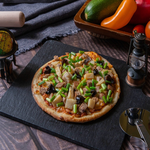 口感與創意的美食冒險!從傳統的道地台式熱炒口味,到創意無限的披薩新滋味,結合了台灣豬絞肉、筍、木耳、韭菜花等各種精選食材。新鮮木耳取代了黑豆豉,散發著香氣,搭配韭菜花與肉末相互輝映。豬肉經過高溫炒製,口感鮮嫩多汁;韭菜花和木耳的清脆口感,和著濃郁乳酪的香氣在口中綻放。每一口的鹹香勁辣,都是對味蕾的極致挑戰,引領家常味道與異國風情完美融合的經典之作。