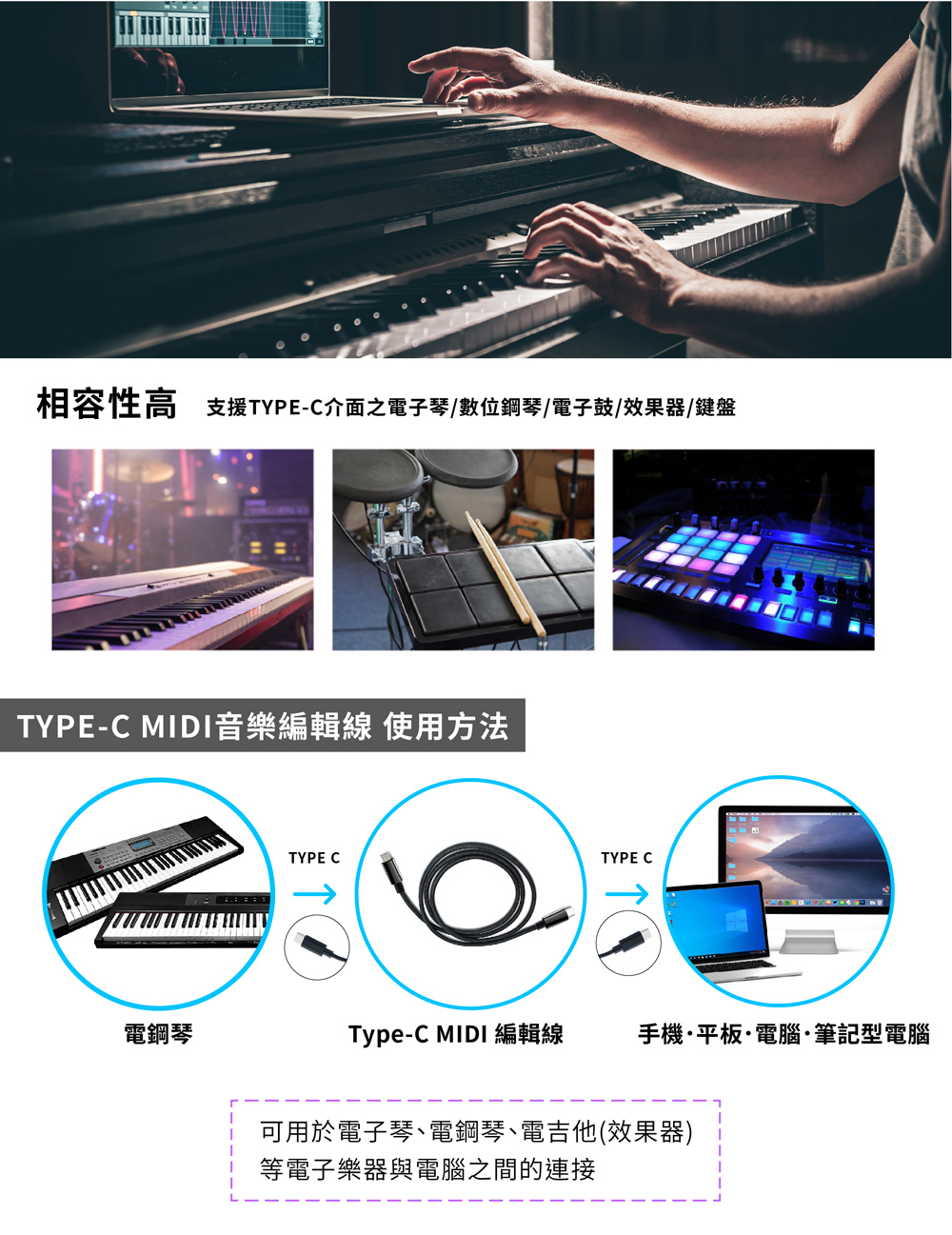 ●相容性高:支援TYPE-C介面之電子琴/數位鋼琴/電子鼓/效果器/鍵盤