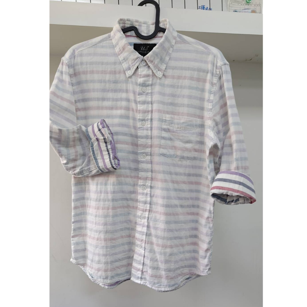 【二手良品中古衣】173號US七分袖透氣雙層紗材質外白內條紋休閒襯衫罩衫防晒