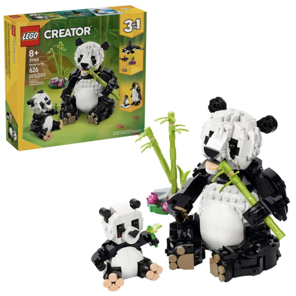 8 歲以上孩子可暢玩這款野生動物:熊貓家庭(31165)盒組,體驗 3 組動物家庭的親情和樂趣。熊貓玩具包含成年熊貓(有可動的嘴巴、頭、脖子與腳掌)與可愛的熊貓寶寶,並配有竹筍,可讓牠們當作點心吃。 孩子可選擇用同一組積木拼砌 3 組不同的樂高® 動物模型:可擺姿勢的熊貓玩偶和在竹莖旁邊的小熊貓;可擺姿勢的虎鯨玩偶與小虎鯨,兩者可擺在透明支架上一起展示;或是可擺姿勢的企鵝玩具和位在一片冰和水上的小企鵝。3 種場景都是適合孩子的絕佳樂高贈禮,可用於想像遊戲與展示。 每款樂高創意百變系列 3 合 1 盒組均有 3 種不同模型可選擇組裝,能激發孩子的創意!他們一定會興奮地拼砌、重新拼砌,然後再次拼砌。這些 3 合 1 盒組提供一系列最符合孩子愛好的模型,包括極速交通工具、令人驚嘆的動物和房屋。請注意:模型無法同時拼砌。 1 套盒組為孩子提供 3 種動物模型拼砌選擇-LEGO® Creator 野生動物:熊貓家庭盒組讓 8 歲以上女孩與男孩用相同積木拼砌和重新拼砌 3 種不同的動物家庭 無盡的遊戲選擇-孩子可用 3 組不同模型上演故事(模型無法同時拼砌):熊貓與小熊貓、虎鯨和小虎鯨,以及企鵝與小企鵝