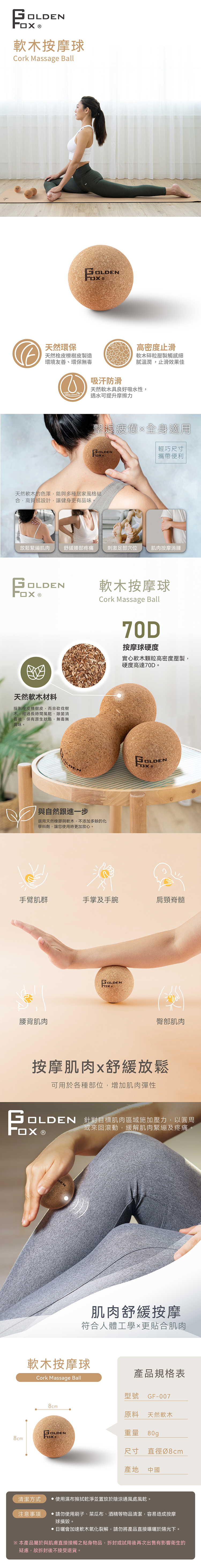70D高密度軟木碎粒壓製而成,硬度適中,能有效舒緩肌肉緊繃,促進循環。