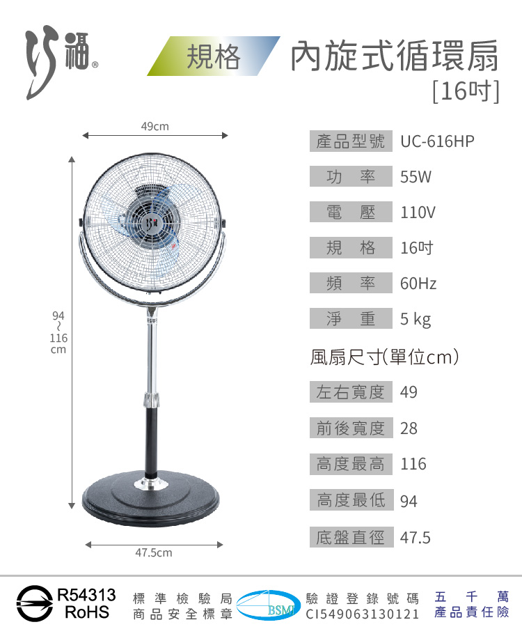 【巧福】內旋式循環扇 UC-616HP MIT /馬達保固2年