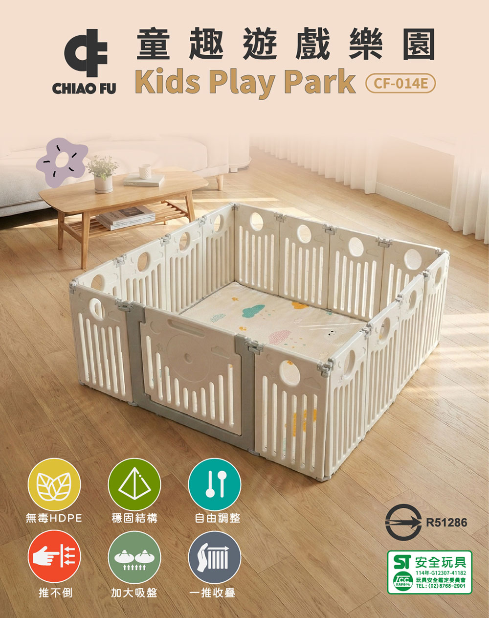產品通過 ST認證 與 標準檢驗局檢驗,並選用 HDPE 無毒環保材質,讓爸媽安心,孩子盡情探索、快樂成長。