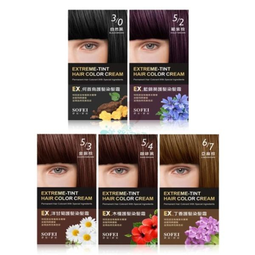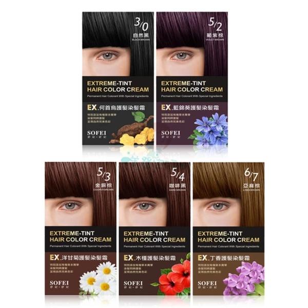 舒妃 SOFEI EX植物添加護髮染髮霜 全新商品 台灣製 容量第一劑:50ml、第二劑:50ml、植物添加精露7ml EX 丁香6/7亞麻棕 EX 藍錦葵5/2葡紫棕 EX 洋甘菊5/3金銅棕 EX 木槿5/4咖啡黑 EX 何首烏3/0自然黑