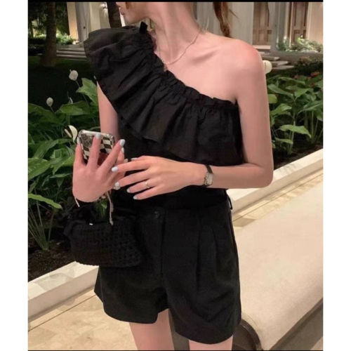 荷葉邊斜肩無袖連身褲(黑色)one size