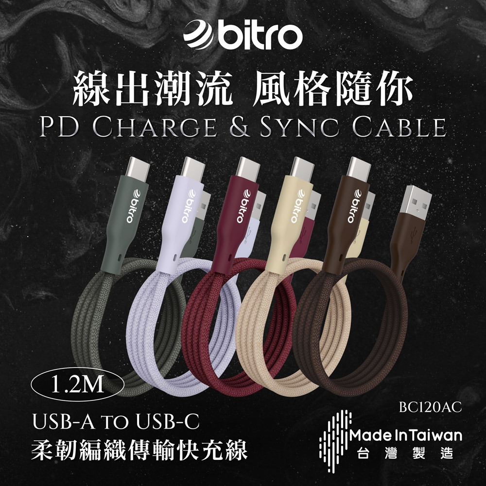 bitro USB-A To Type-C 編織充電線 120CM適用安卓蘋果手機 行動電源 台灣製造