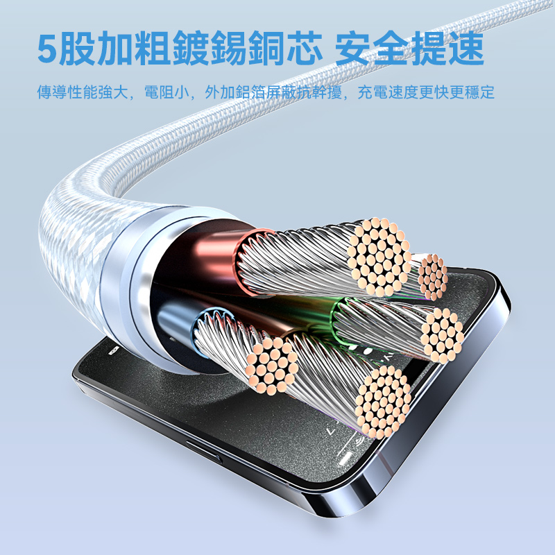 📌5股加粗鍍錫銅芯,傳導性能強大,電阻小,外加鋁箔屏蔽抗干擾,充電速度更快更穩定