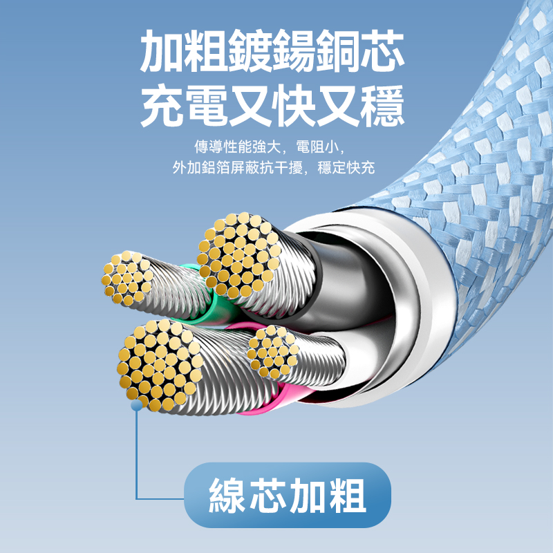 📌5股加粗鍍錫銅芯,傳導性能強大,電阻小,外加鋁箔屏蔽抗干擾,充電速度更快更穩定