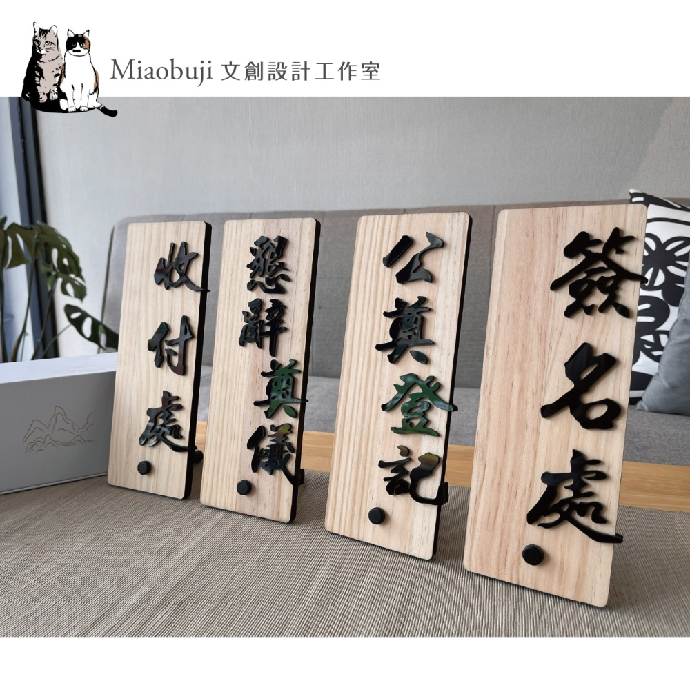 每組完整包含 4 種桌上標示牌(簽名處、公奠登記、懇辭奠儀、收付處),不單售單片。