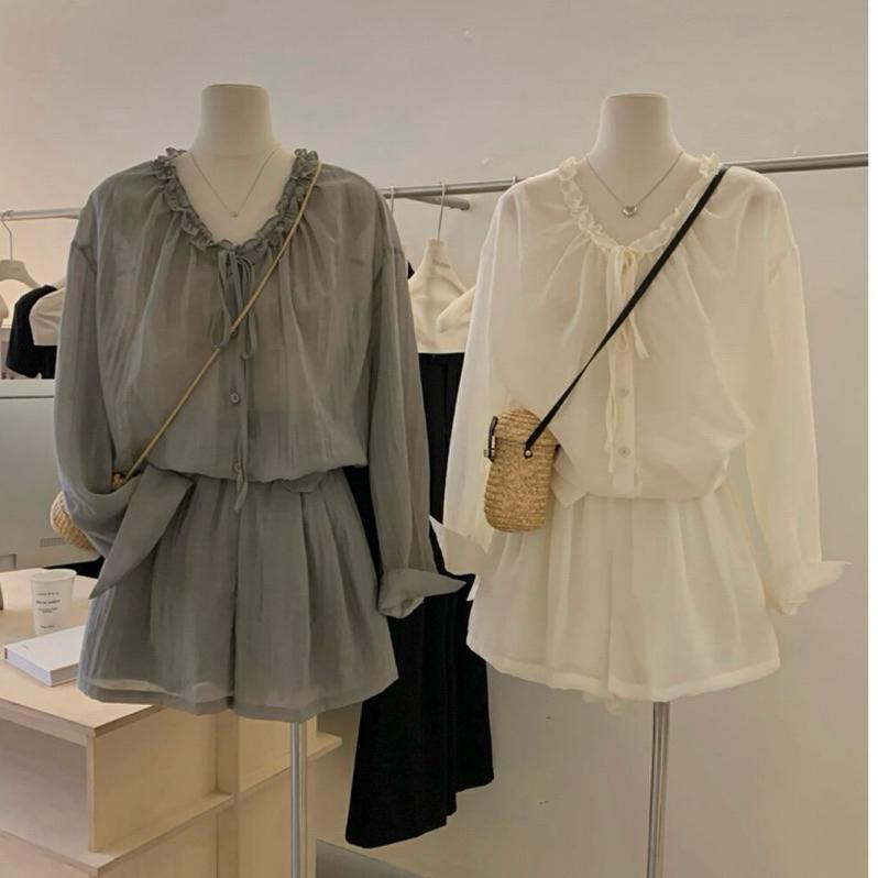 𝐑𝐈𝐂𝐇|現貨*溫柔氣質花邊領口抽繩設計上衣+寬鬆休閒短褲套裝5863