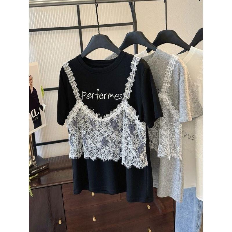 𝐑𝐈𝐂𝐇|現貨🔥假兩件拼蕾絲短袖上衣