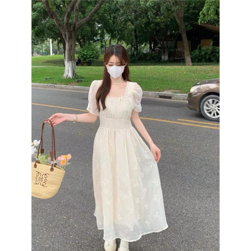 𝐑𝐈𝐂𝐇|現貨🔥實拍*溫柔仙氣刺繡方領收腰後綁帶泡泡袖中長款洋裝