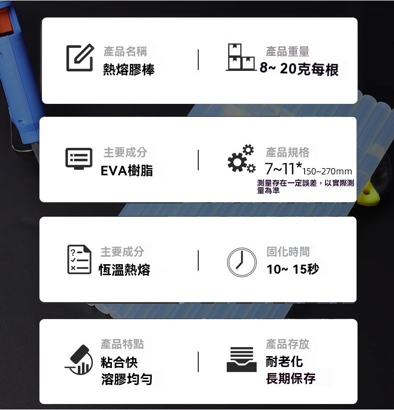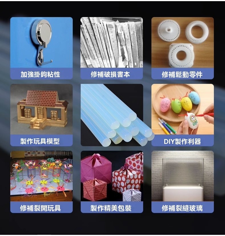 優質熱熔膠條,快速熔融,黏合力強,適用多種材質,修補、手工DIY都輕鬆完成。