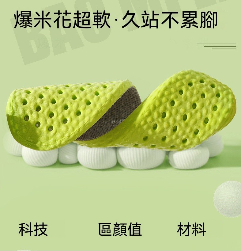 採用爆米花材質(高彈EVA),行走回彈性佳,緩衝每一步壓力。