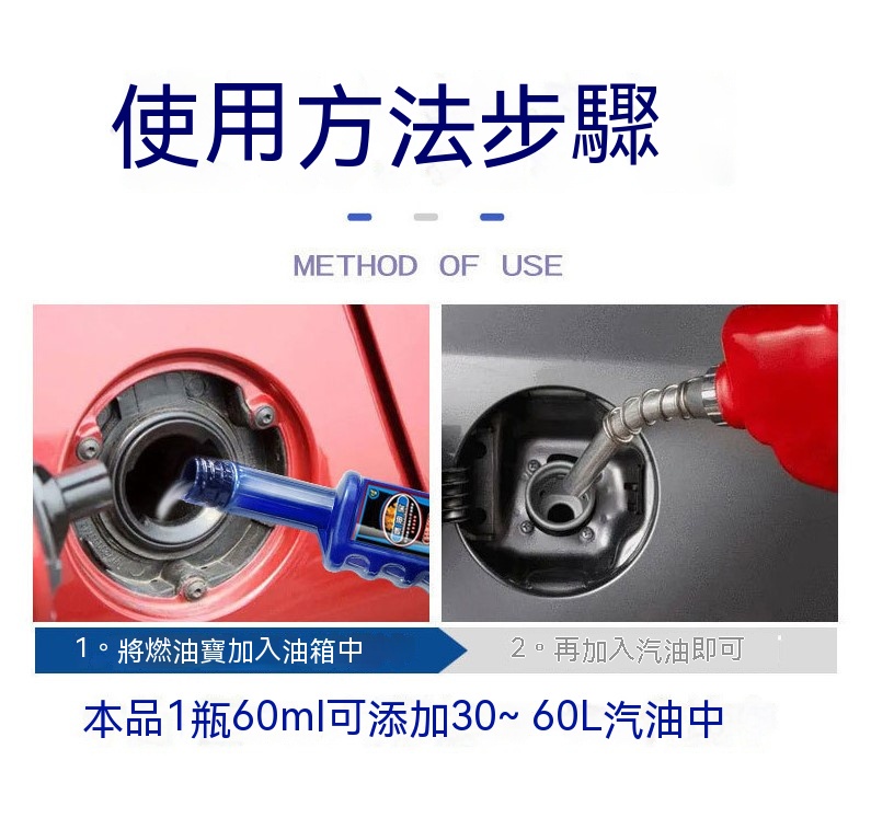 📣.30-60升汽油都可以添加1-2瓶(第一次使用建議添加2瓶,之後可以根據駕駛舒適度感受選擇添加1/2瓶)60升以上汽油需要添加2瓶