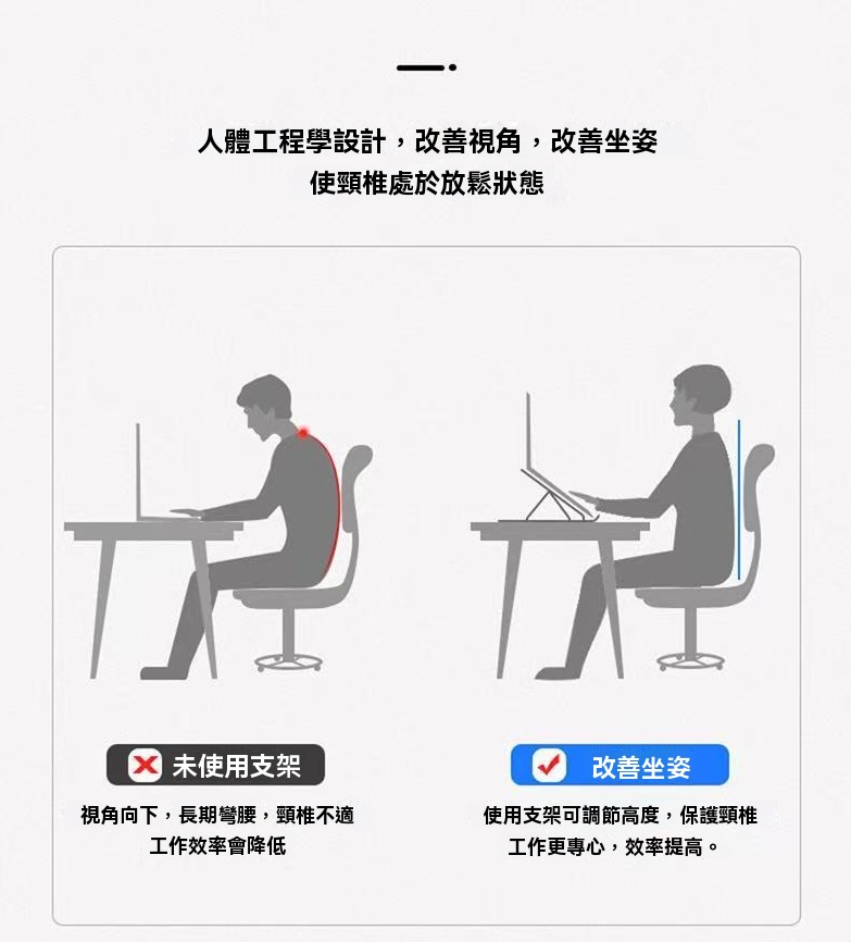 📐 人體工學設計:抬高螢幕高度,改善低頭姿勢,保護頸椎。