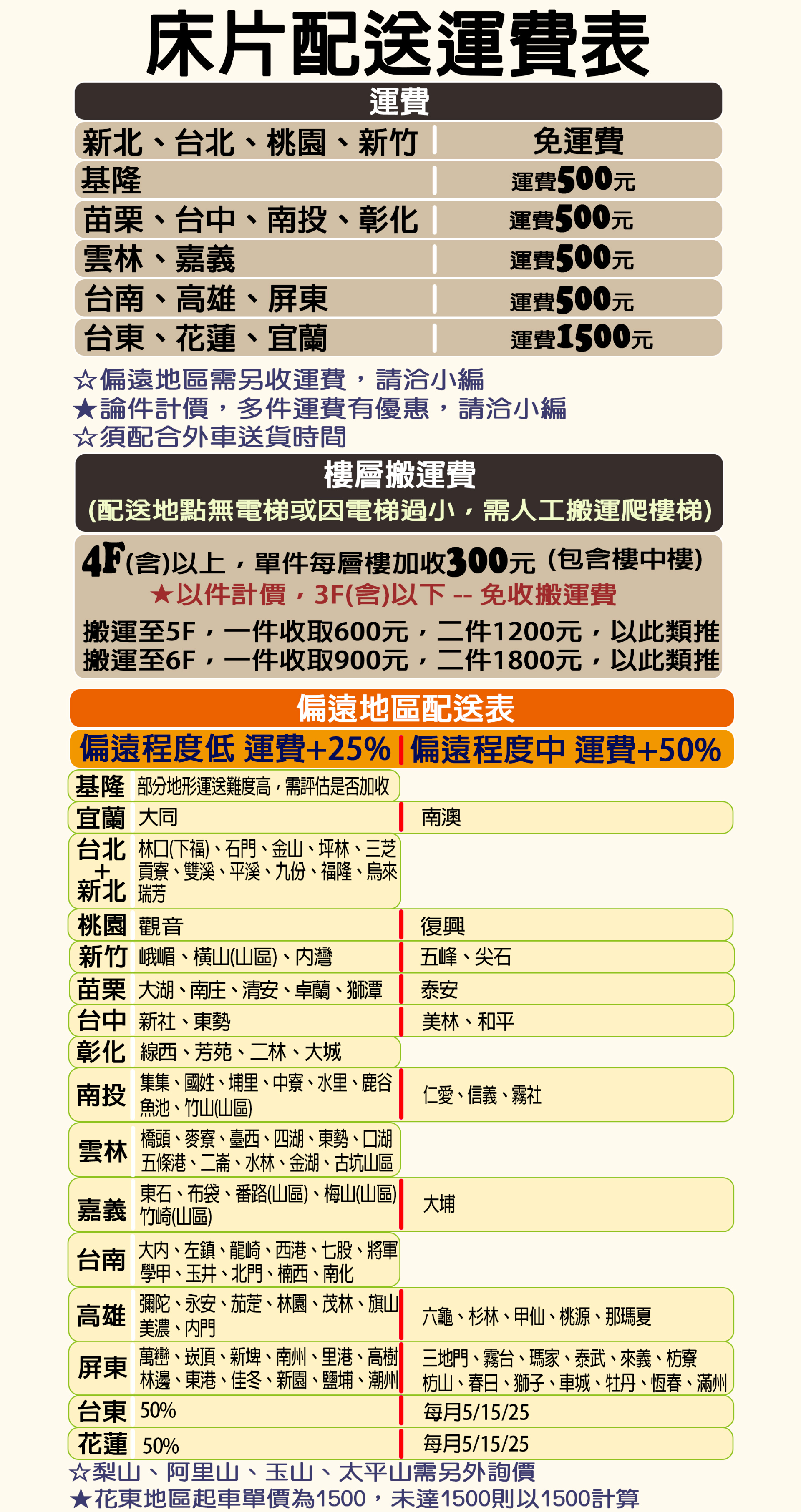 ※因本公司非常注重品質服務,送貨效率,都由本公司專業司機,所以配送運送範圍有限,如其他縣市可至聯絡我們詢問,運費另計。