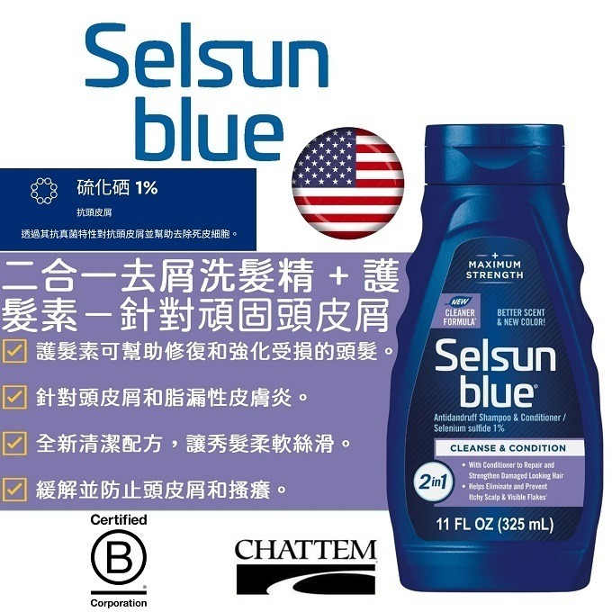 使用 Selsun Blue 二合一強效去屑洗髮精和護髮素,快速為新的一天做好準備,向頭皮屑說“再見”,讓您展現最佳狀態。這款洗髮精和護髮素只需簡單一步即可清潔、調理、修復和強化頭髮。這款強效去屑洗髮精配方以硫化硒為主要成分,有助於控制頑固的頭皮屑症狀。這款去屑洗髮精有助於預防和消除頭皮屑引起的頭皮發癢和可見的頭皮屑。