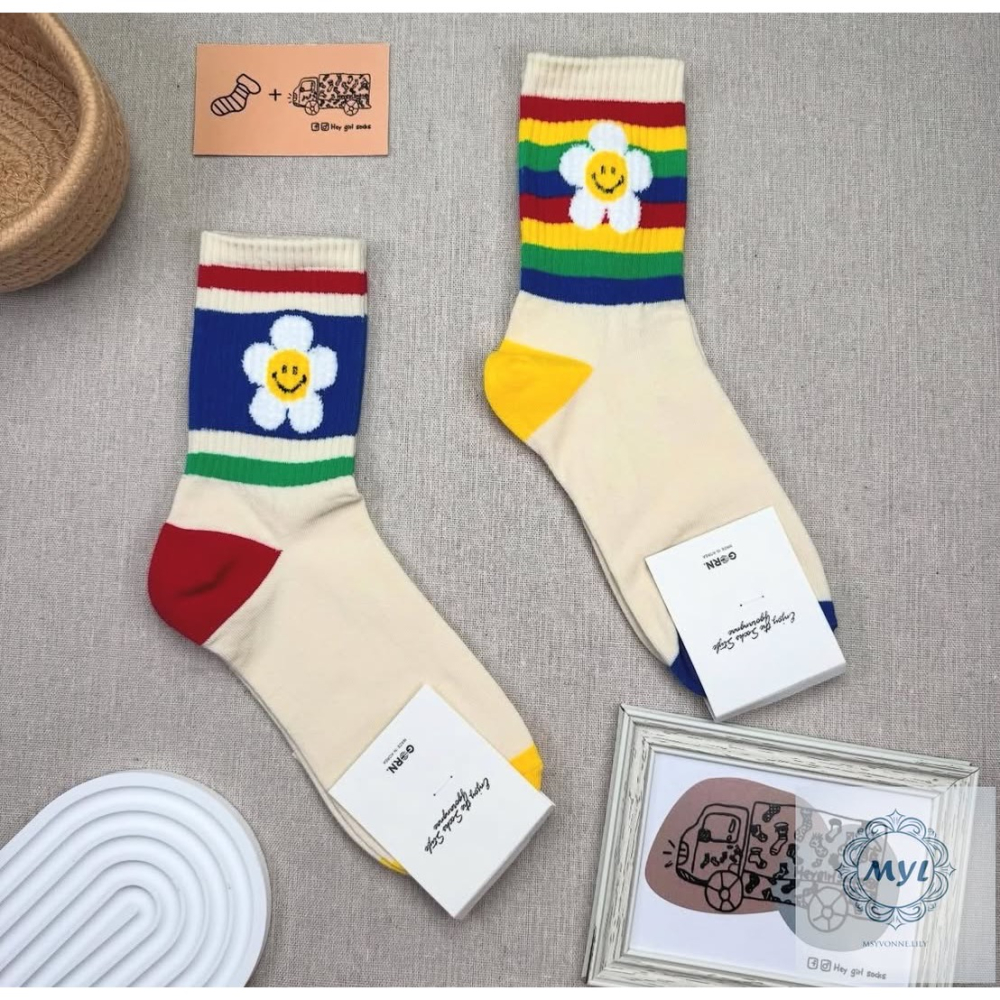 顏色搭配:米白襪身 + 彩虹花朵(紅、藍、綠、黃)