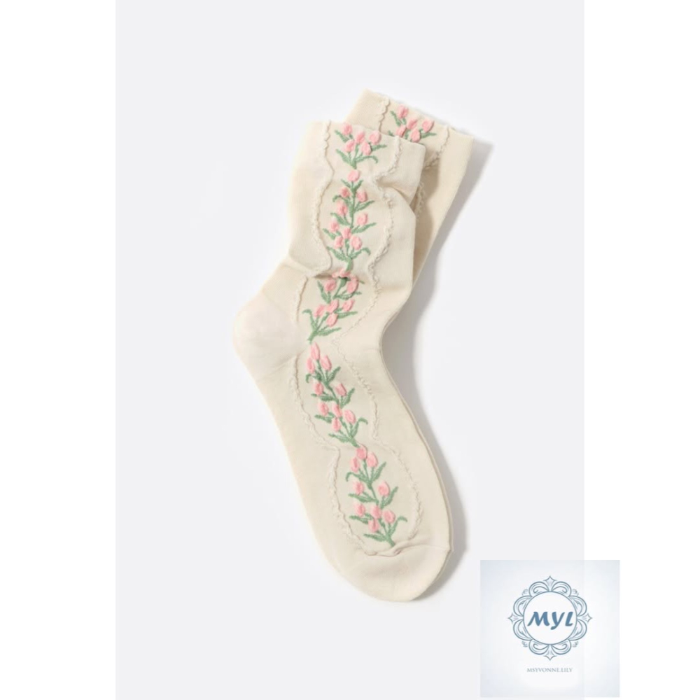 沿著襪身蜿蜒而上的粉嫩花苞搭配嫩綠枝葉,彷彿春日藤蔓,優雅且靈動,具濃厚手工藝氣息。