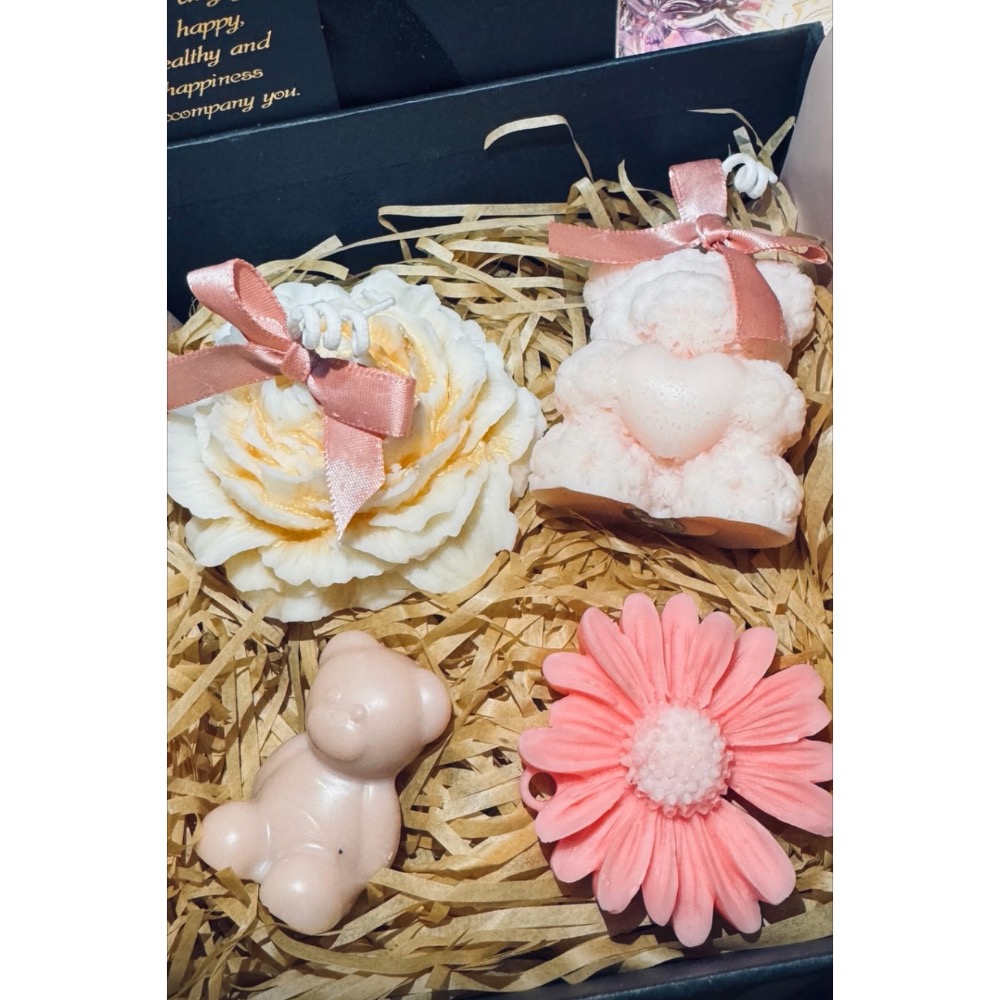 這款蠟燭禮盒內含多款精緻造型:玫瑰花、粉雛菊、小熊與愛心熊,每一件皆由手工細雕,融入天然白峰蠟的純淨質感與天然精油的柔和香氣。